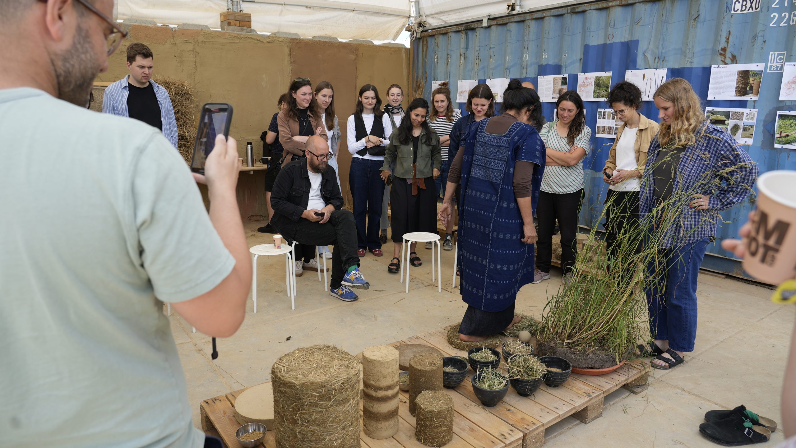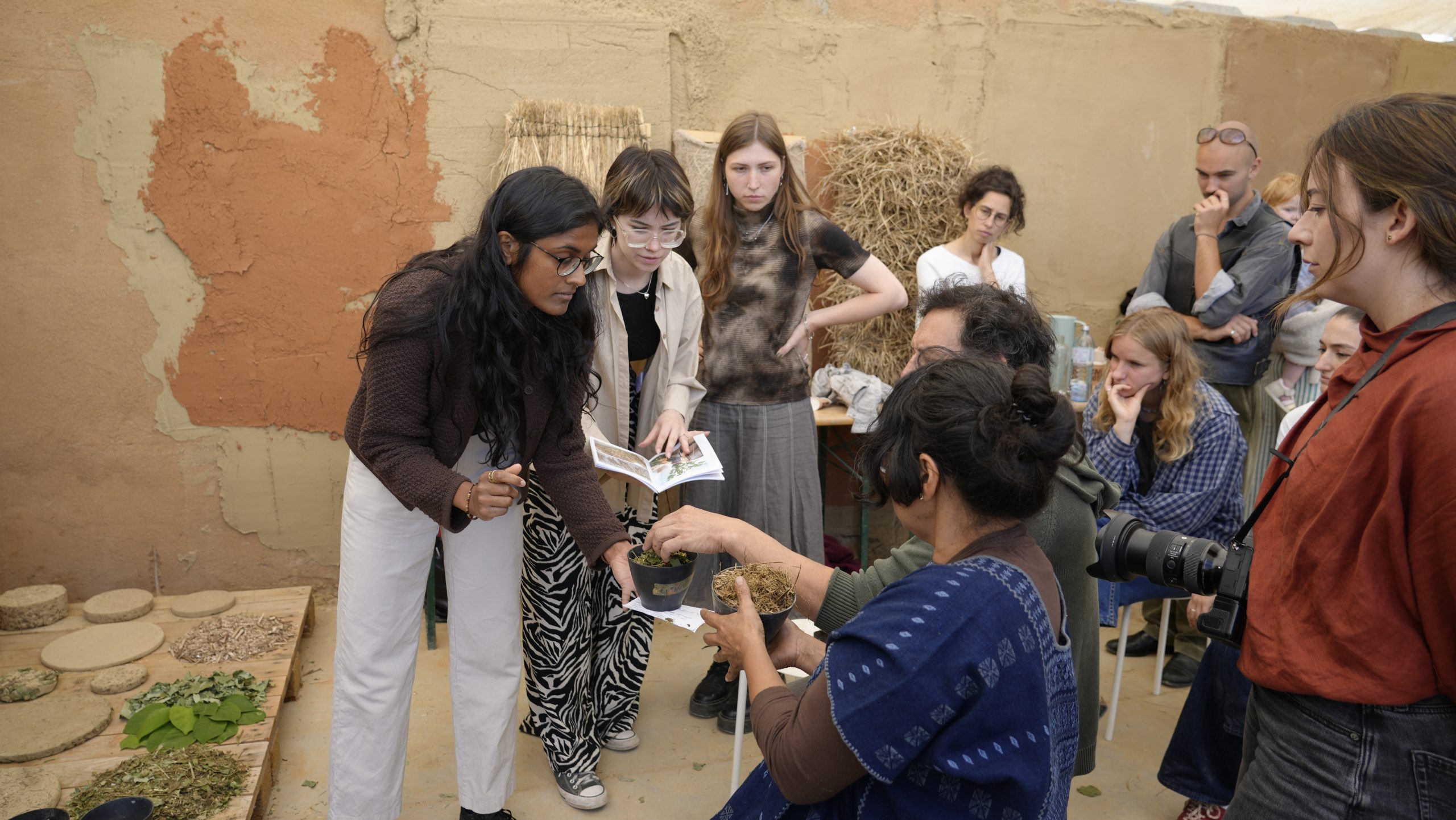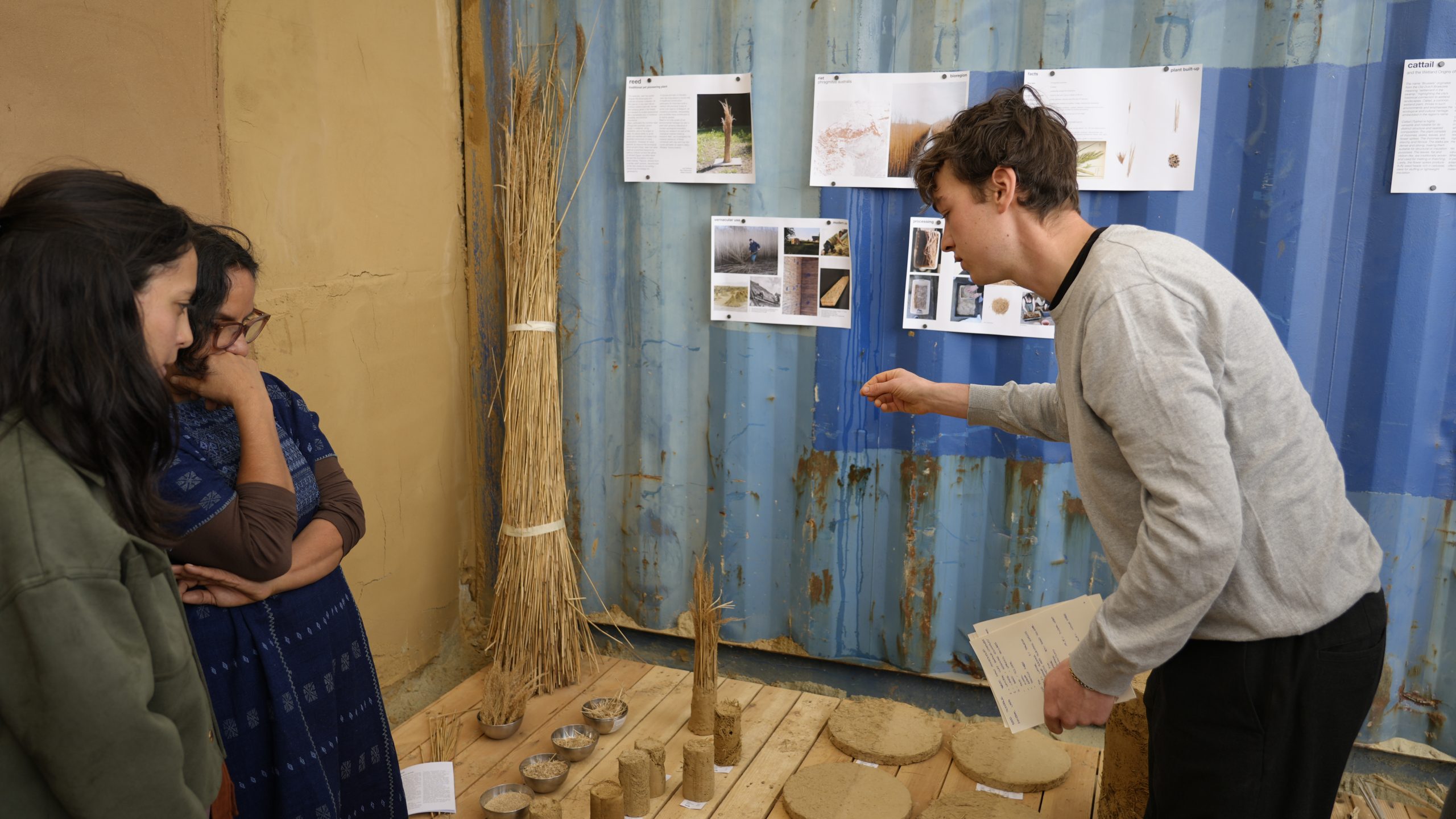 In June 2025, students presented their findings to Delcy Morelos, her collaborator Emiliano García (studio ASPJ), and the BC Studies team. Mixing loam from the Brussels areas with Japanese knotweed, cattail, flax, meadow grass, nettle, and reed, they revealed the qualities of these local fibres.